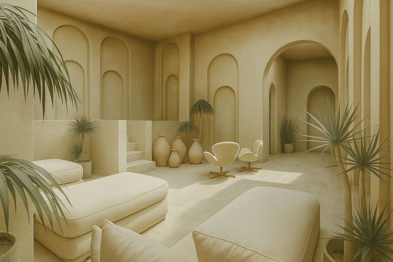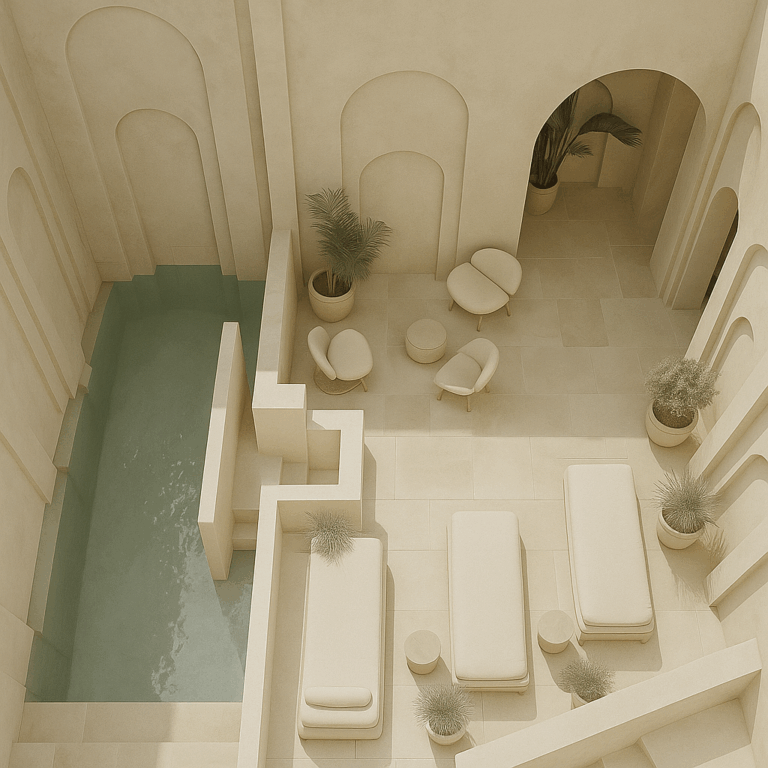 Designed as an interpretation of an archetypal hammam, the spa’s sculpted volume exudes timeless elegance, drawing from the influences of Petra, Jordan, and ancient Rome. Unlike ornate spas of the Arabic world, we embrace simplicity with materials like hard stone, wood, and braided fabric, complemented by techniques for a seamless, distraction-free atmosphere. Our sandstone and mud-colored envelope is adorned with lush greenery, creating a verdant oasis that harmonizes with light-colored furnishings.